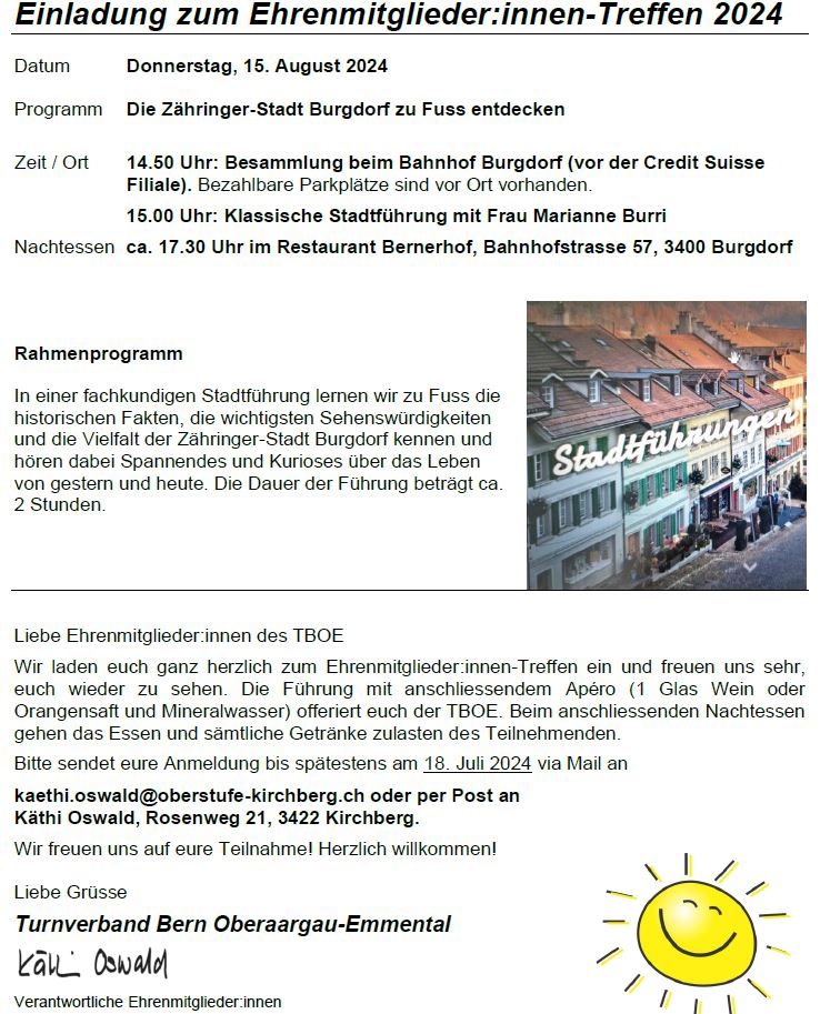 Wir laden euch ganz herzlich zum Ehrenmitglieder:innen-Treffen ein und freuen uns sehr, euch wieder zu sehen. Die Führung mit anschliessendem Apéro (1 Glas Wein oder Orangensaft und Mineralwasser) offeriert euch der TBOE. Beim anschliessenden Nachtessen gehen das Essen und sämtliche Getränke zulasten des Teilnehmenden.